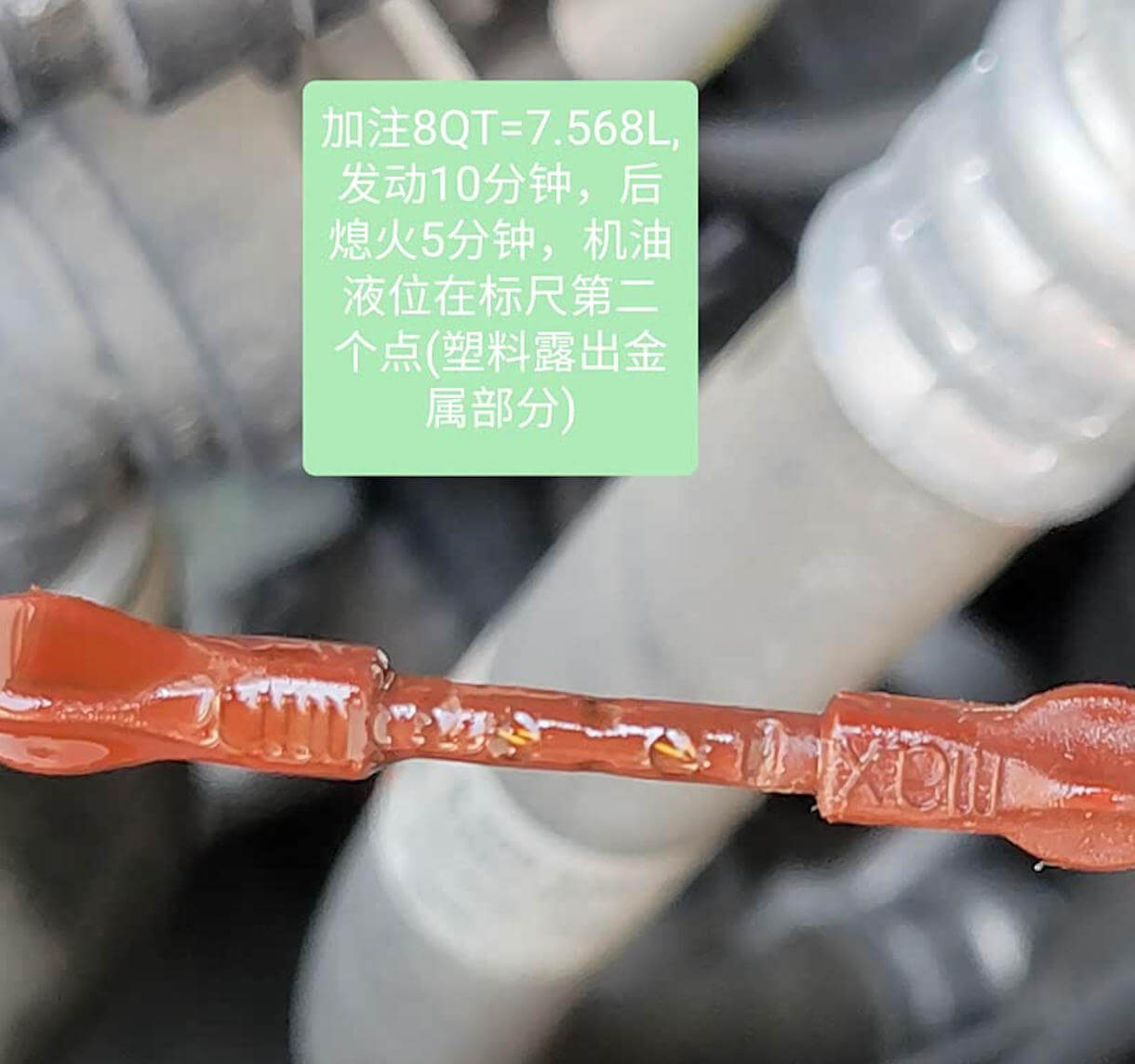 2、先加个6.5升左右,用机油尺试一下机油深度,差不多的话可以开个几十公里静置一个晚上看看是什么位置,不够再加。