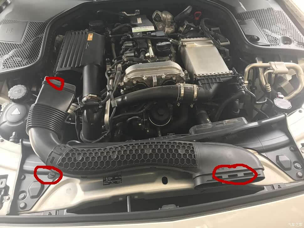 2、进气管左下边拧至——横杠用线拴住向上使劲拽,就可以下来,两头向下摁向外掰就可以卸下,主要是为了拆下机滤。
