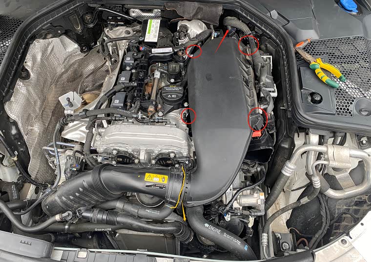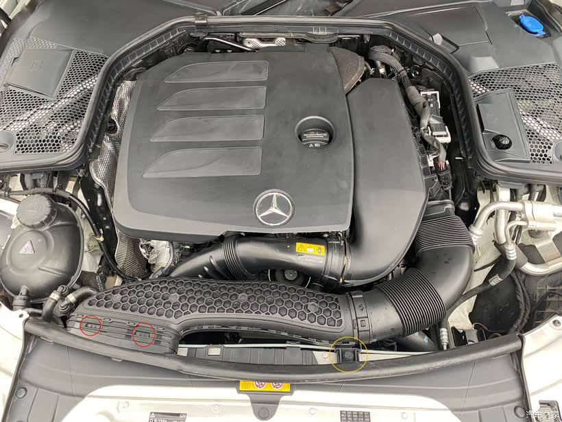 1、第一步先取下进气管子,这里要先取掉黄色圈内的塑料卡子,左边红色圈位置是突出的卡扣,注意在下方中间位置也有一个,稍用点技巧即可徒手取下进去支管。