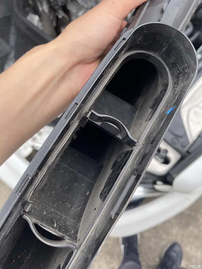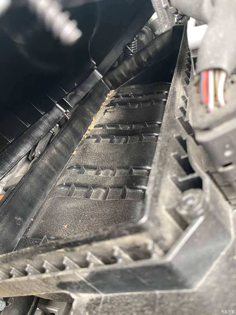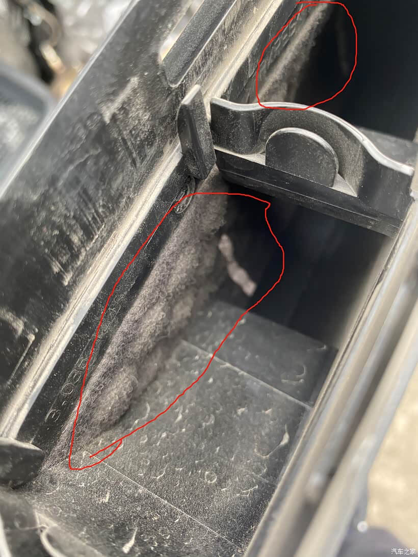 4、然后打开滤芯盖子,一开始感觉不是很脏,结果拿掉滤芯才发现,整个盒子里里外外全是灰尘,特别是里面角落位置,有很多树叶碎渣。
