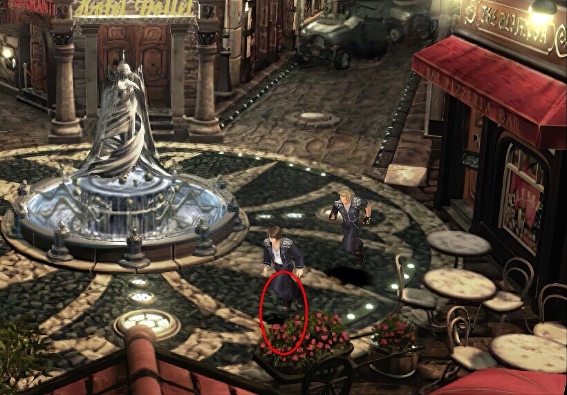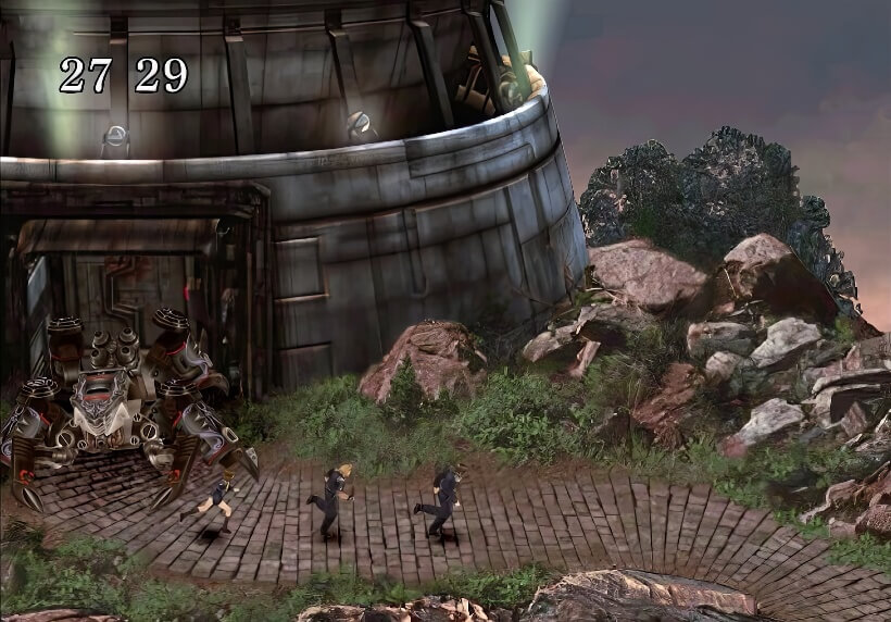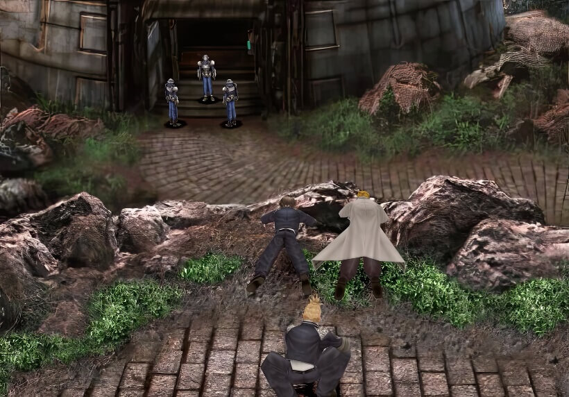 众人在中央广场等得正无聊(只要和赛法谈话便可以继续剧情),突然传来了狗叫声,3人急忙躲在一旁,竟发现有一队敌人向左上角的通路走了过去,行踪非常的可疑,看来他们的目标是山顶的电波塔。