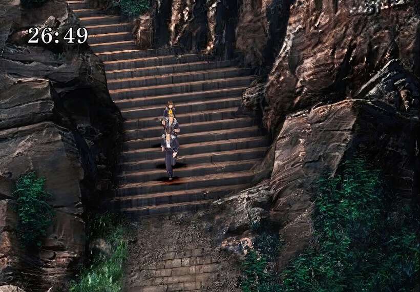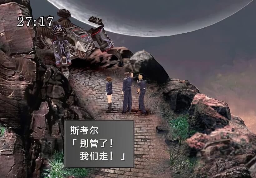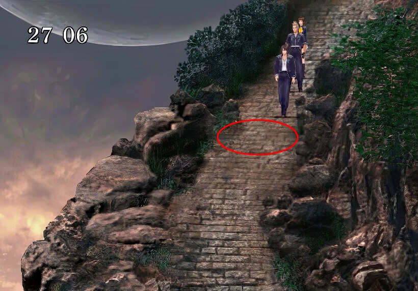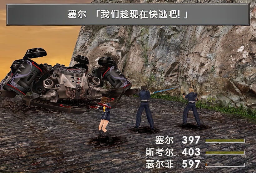 如果跟着跳下的话,在和瑟尔菲汇合之前可以不遇敌,但是会被扣SeeD评价分。所以当然是要选择:不要跳,从右面的通路绕下山去与瑟尔菲汇合。