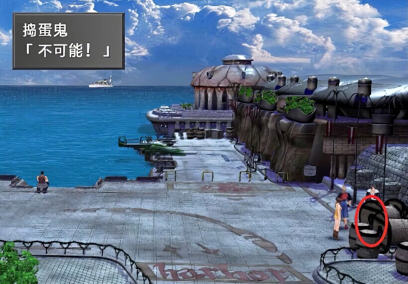 在港口调查屏幕右侧木桶的后面(如上图位置),可以发现捣蛋鬼。他似乎说要拯救什么东西(其实就是下文的青蛙)……