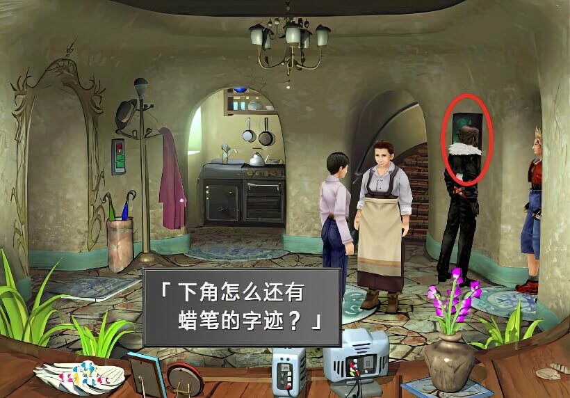 在上个事件之后,走出巴拉姆镇再返回,当捣蛋鬼的妈妈再次出现在塞尔家门厅的时候,进入客厅与捣蛋鬼对话,得知他在画上签名。之后,调查门厅右边墙上的画(左图圆圈处),发现捣蛋鬼的涂鸦(塞尔却以为是自己小时候涂的)。