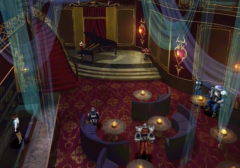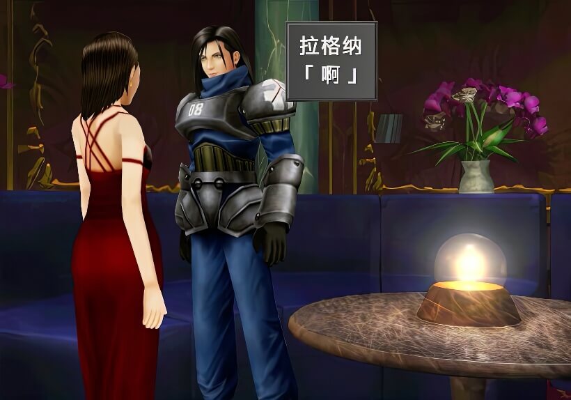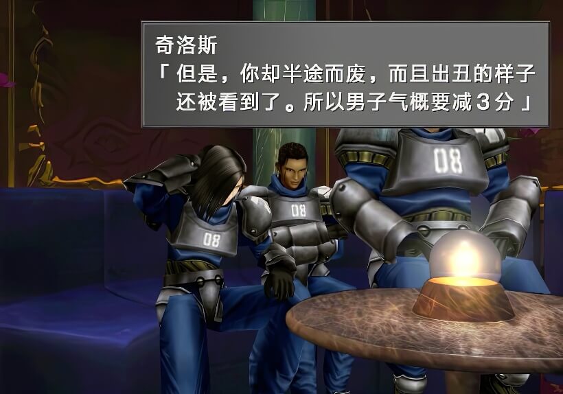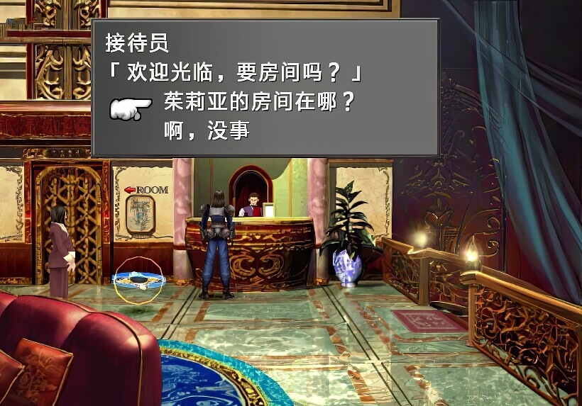 在旅馆中,从右边的楼梯下去,便可来到旅馆的地下酒吧。与女侍者谈话,选择第二项便可坐下,但如果不断选择灰色的最后一项(是斯考尔在拉格纳的意识中说的话),则会把女侍者吓跑……🤣