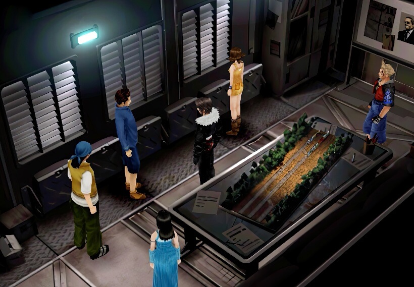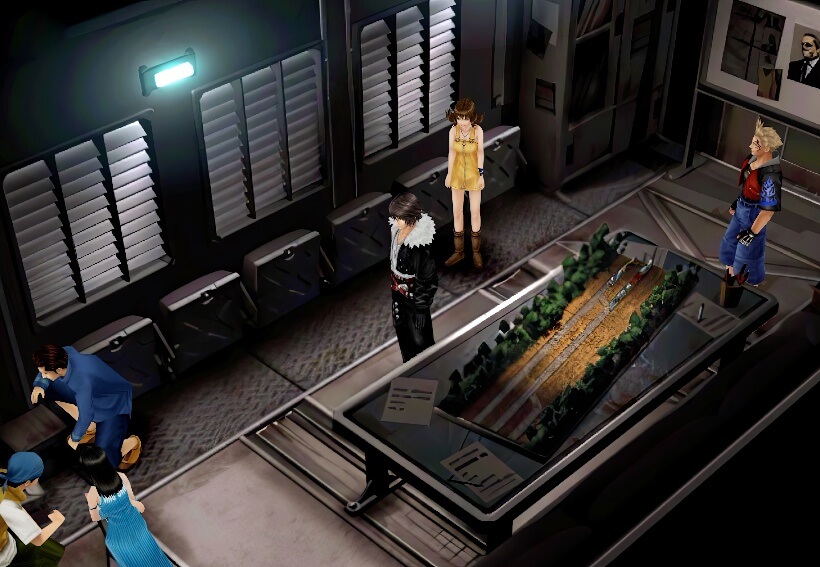 虽然讲解计划这部分比较沉闷,但仔细留意的话,还是有些有趣的话题的,比如瑟尔菲有些许暴力倾向(要用火箭炮轰车)、莉诺雅做的总统车厢模型太烂还硬说是出于对总统的憎恶等等。另外,会议室墙上的剪报也可以看看,是关于揭露迪领总统黑暗面的文章,其中还提到了D区监狱和导弹基地。