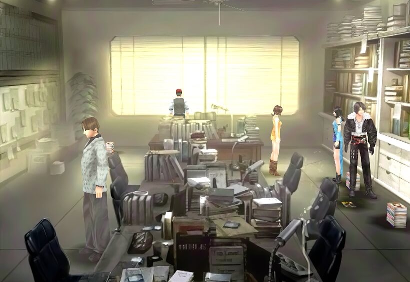 从上个场景进入最里边的门,可到达杂志社的编辑部,地上有一本旧杂志汀柏·狂热可以拿。与最里面的主编对话,则可了解到关于汀柏·狂热是这里出版的杂志的事情。不过不要期待他能说出什么,他只会抱怨,最后还把斯考尔等人气走。