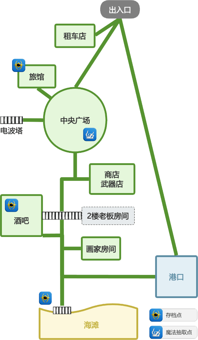 | 存档点 | 旅馆、酒吧二楼(隐藏)、海滩楼梯上方 |