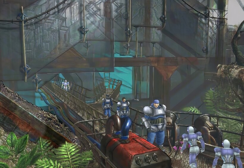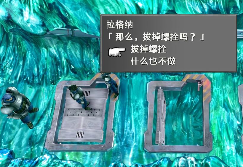 调查炸弹,先按下红色开关(选择第二项),这样,远处的圆石滚动起来,趋走一些艾斯达士兵,并且由于震动,而使三门中左边的仓门开启。如下图: