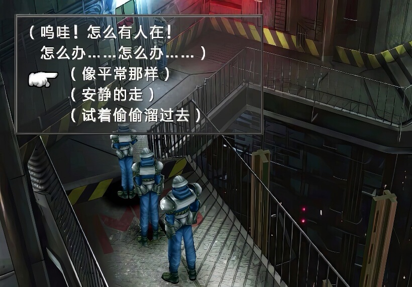进入之后刚走不远,就见前方配电室门前有个守卫,此时会出现如何走路的选项:分别是普通走、安静走、偷偷溜过去。此次选项并不影响什么,只是考验一下玩家的胆量。选择普通走或偷偷溜过去的话,会被守卫训斥,而安静走则会被夸奖有礼数。