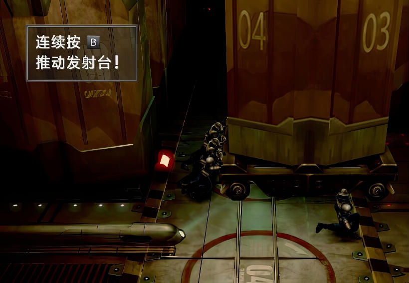 配电室暂时进不去,直接下到底层,正对楼梯的,是导弹发射室(门左侧有个存档点)。从楼梯左侧通道可来到下层平台。