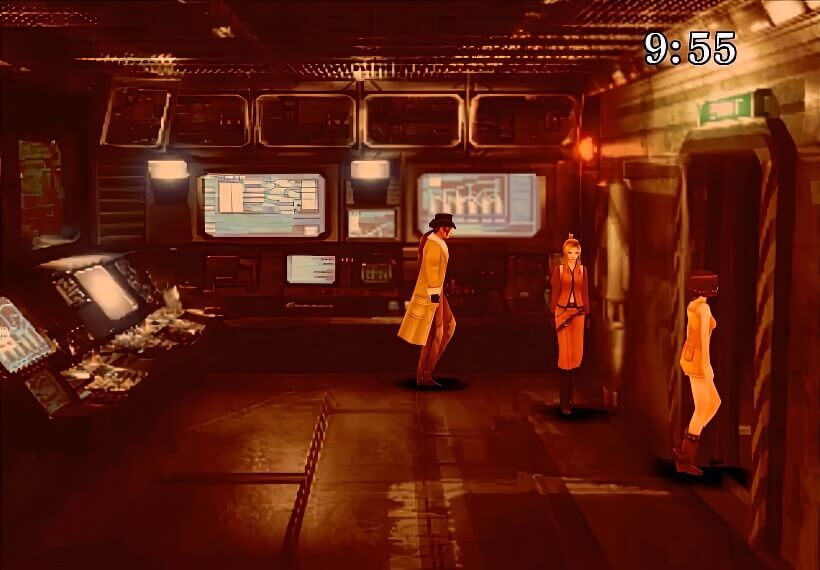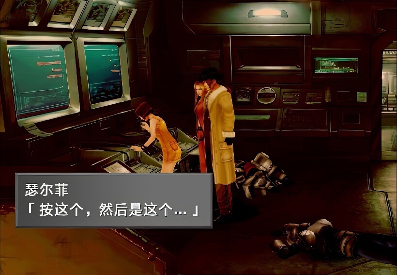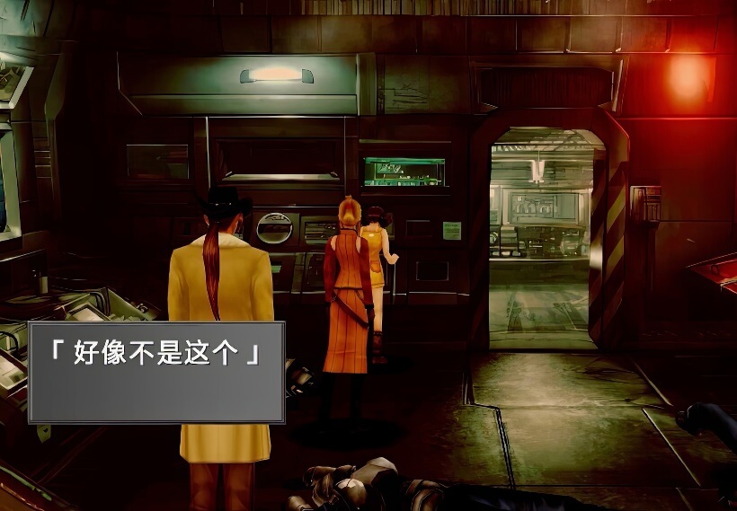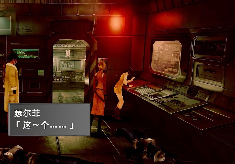 关闭导弹之后,还得找到基地自毁装置。除了左侧电脑之外,也要调查房间中间和右边的电脑(如上图位置,不过如果瑟尔菲一开始调查的不是左侧电脑,那么其他两名队员会代劳),之后才能进入里侧房间。