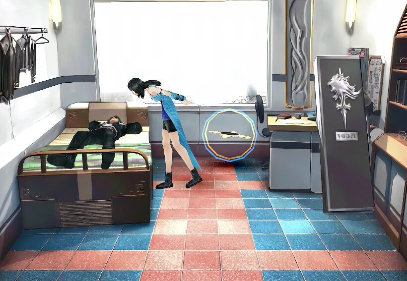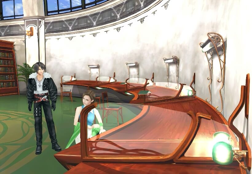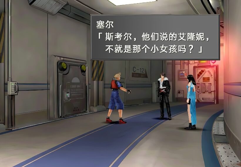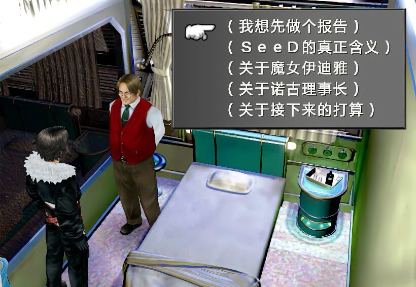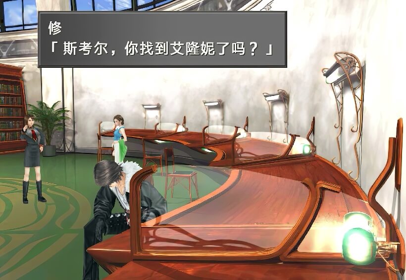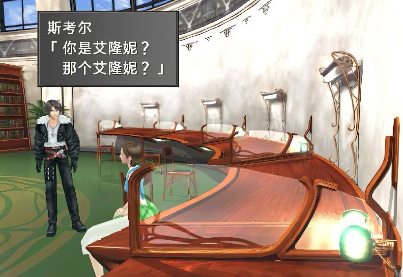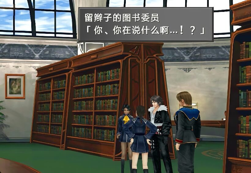 图书馆内场景右侧,有个SeeD在和辫子女孩谈话,谈话内容是关于推荐书籍的,一个黑皮肤的图书管理员提到辫子女孩有个“特别的人”……