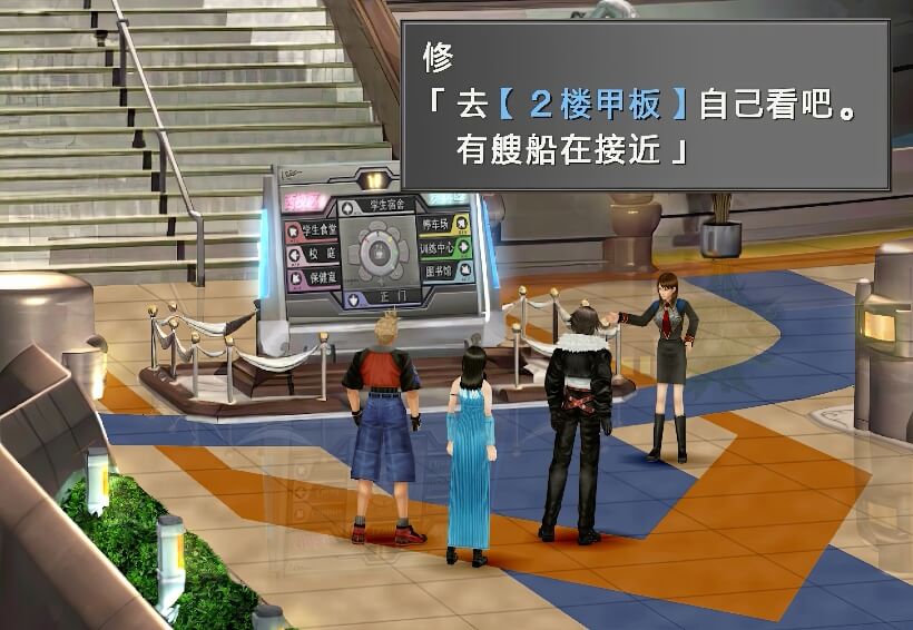 结束与学园长席德的对话,前往1楼大厅,遇到正在找学园长的修,修告知有艘船正在接近学园,或许有危险。