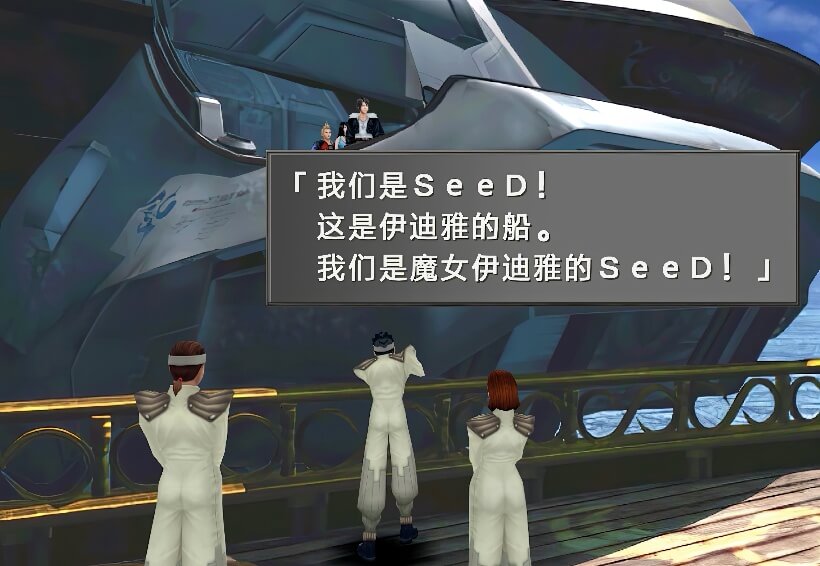 去2楼甲板,看到确实有一艘船已经接近,上面有穿着白色制服的SeeD,他们自称是魔女伊迪雅的SeeD。