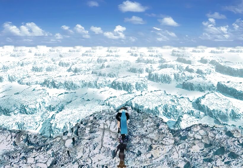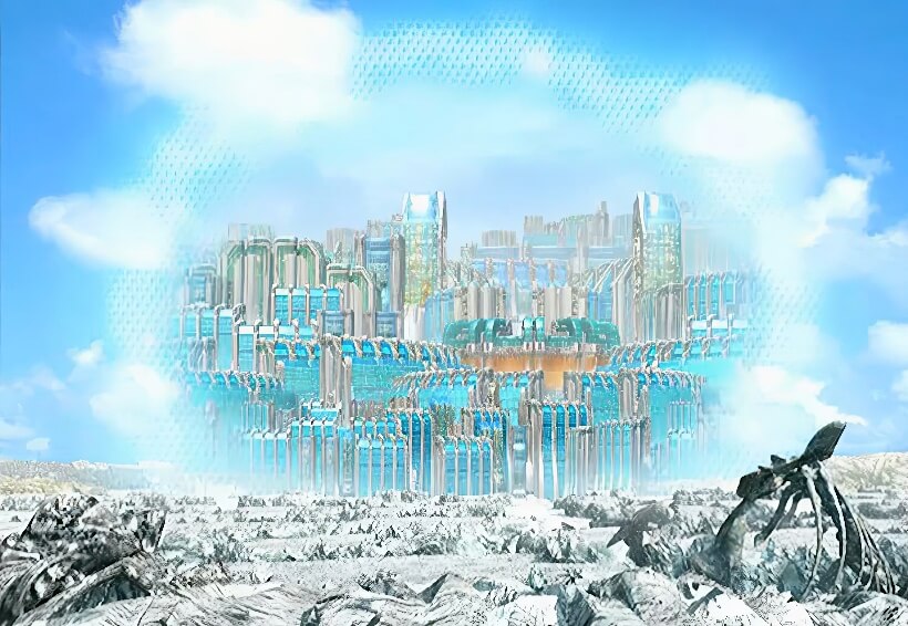 突然,仿佛什么遮盖天地的东西被打开了,眼前的景象发生巨变,原本到处都是冰川石山的荒 凉景象突然由一座高科技都市所取代。