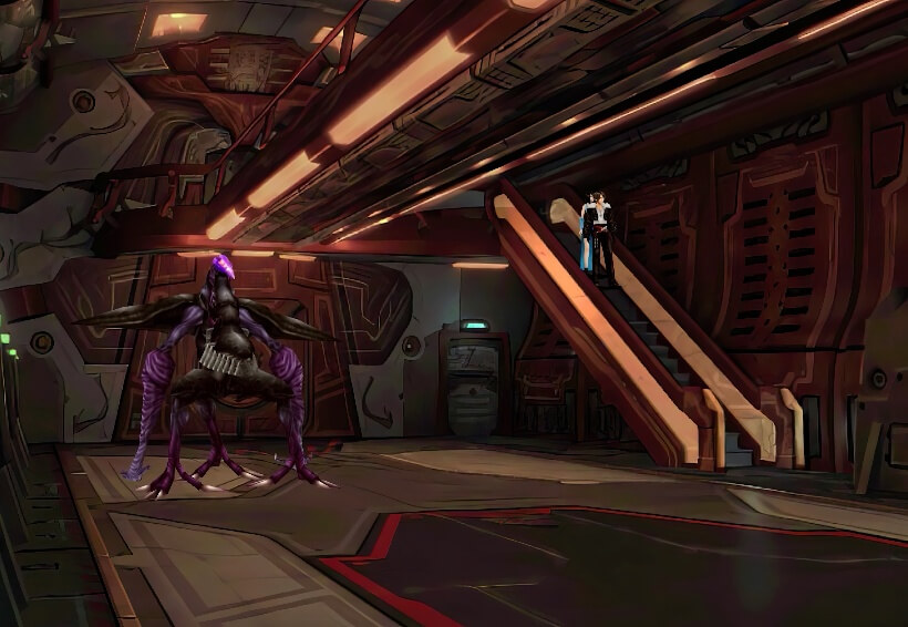 躲避方法:在楼梯口等待异形走到画面下方,迅速从楼梯上下来,进入上方舱门。