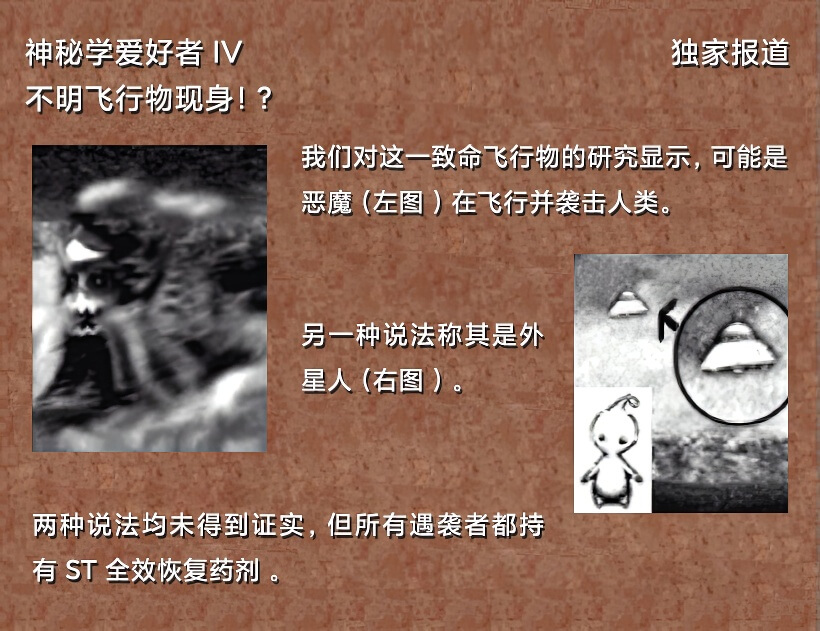玩家在世界地图上的某些地点行走时,会随机遇到无视不遇敌(Enc-None)能力出现的UFO,虽然遭遇方式与遇敌相同,但是却无法攻击,并且可以看到UFO抢走了一些物品。