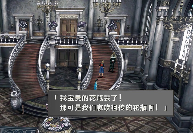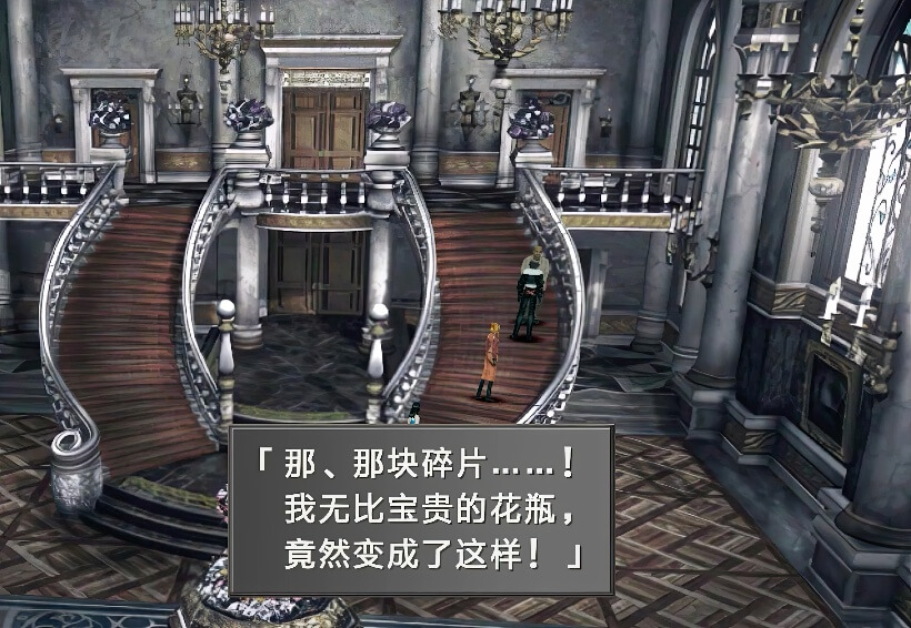 大宅内的盔甲(在大宅内画面左侧)。不过只有当奎斯提斯或亚威恩在队伍中,调查才会有反应(原因是他们其中的一个开了句玩笑)。正要离开盔甲,盔甲突然散掉,跑出来一只小陆行鸟。拣起陆行鸟掉落在地上的物体,可得到第一块花瓶的碎片(Vase Piece)。